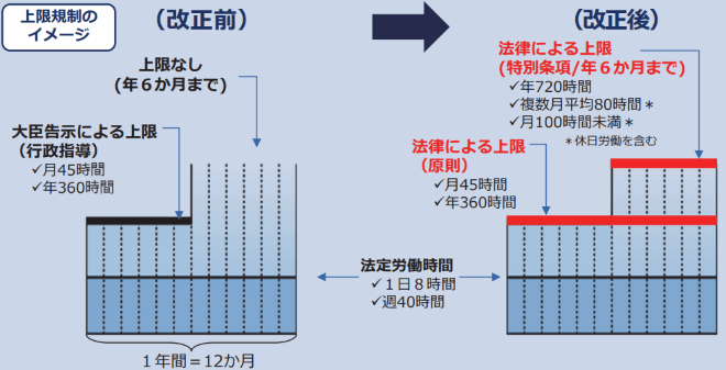 働き方改革関連法による2019年4月労働基準法の改正に伴い、労働時間の上限規定が設けられました。