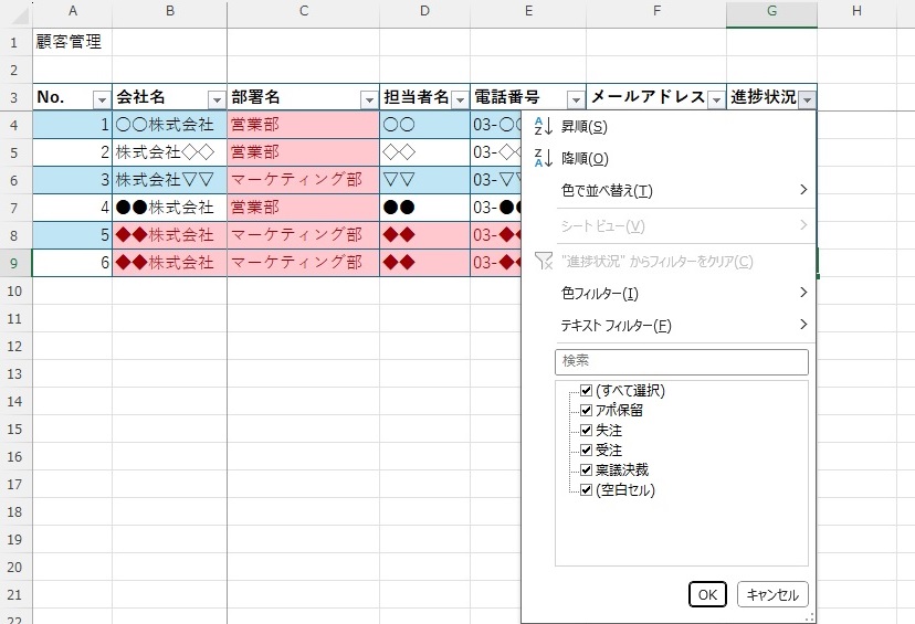 また、セルの右下にある▽をクリックすれば、顧客情報の並び替えや検索が簡単にできます。