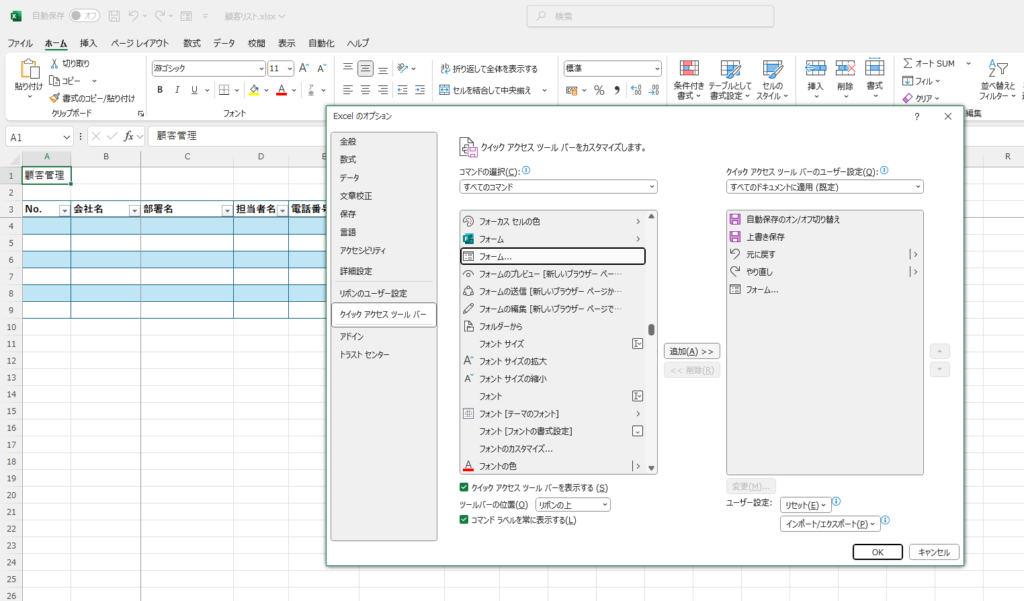 クイックアクセスツールバーにフォームボタンが追加されデータを入力するためのフォーム機能が使用できます。
