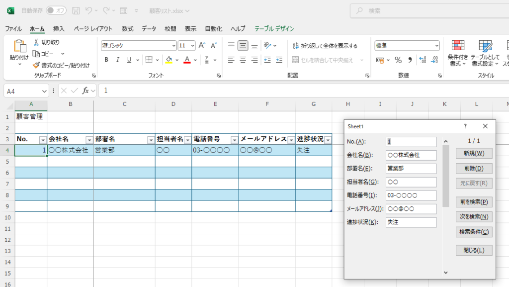 フォーム機能を利用すると、データ入力画面を専用ウィンドウで表示できるため、表のセルを行き来しながら顧客情報を登録する手間を省けます。