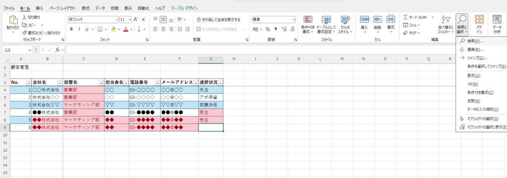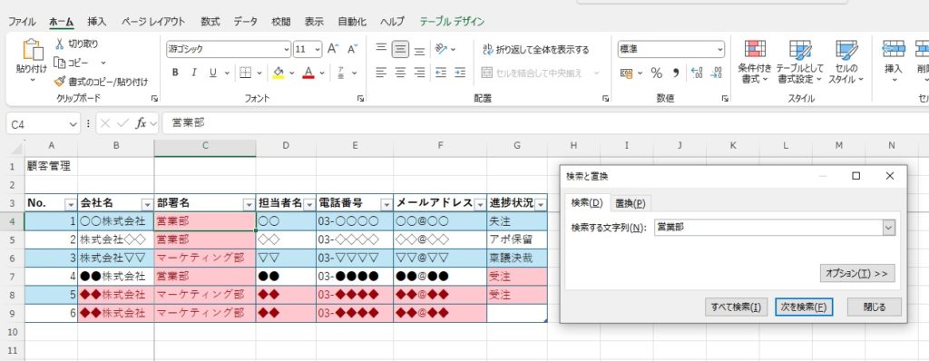 Excelには「Ctrl + F」キー又はホーム画面で利用できる検索機能が搭載されており、企業名や担当者名、電話番号などを一瞬で探し出せます。