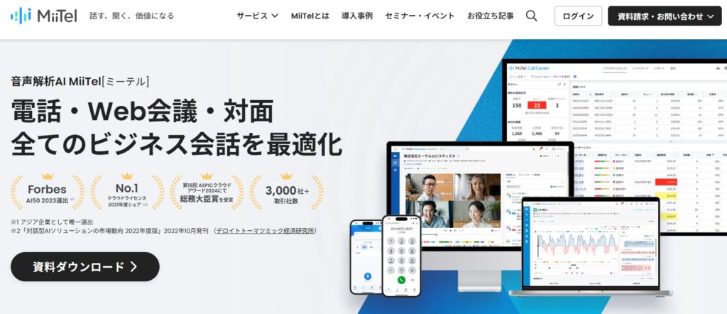 音声解析AIツールMiiTelは、電話・Web会議・対面商談などのビジネス会話を自動で記録・可視化する営業支援ツールです。