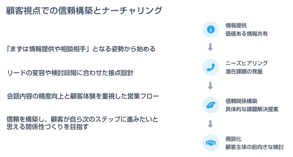 - 無理に次のステップへ進めるのではなく、顧客が「次に進みたい」と感じられる関係性づくり